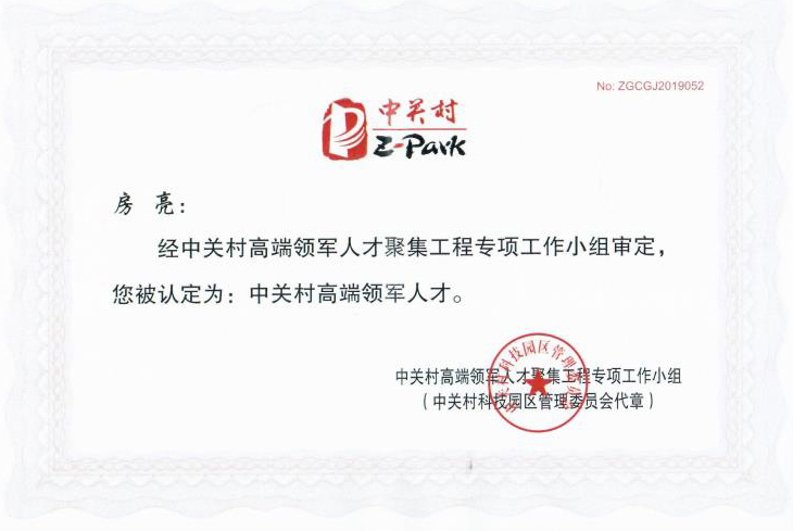 这一次房亮博士获得2019年度中关村高端领军人才的殊荣,不仅是对房亮博士创业领军能力的认可,也是对开云在线注册未来发展的认可。